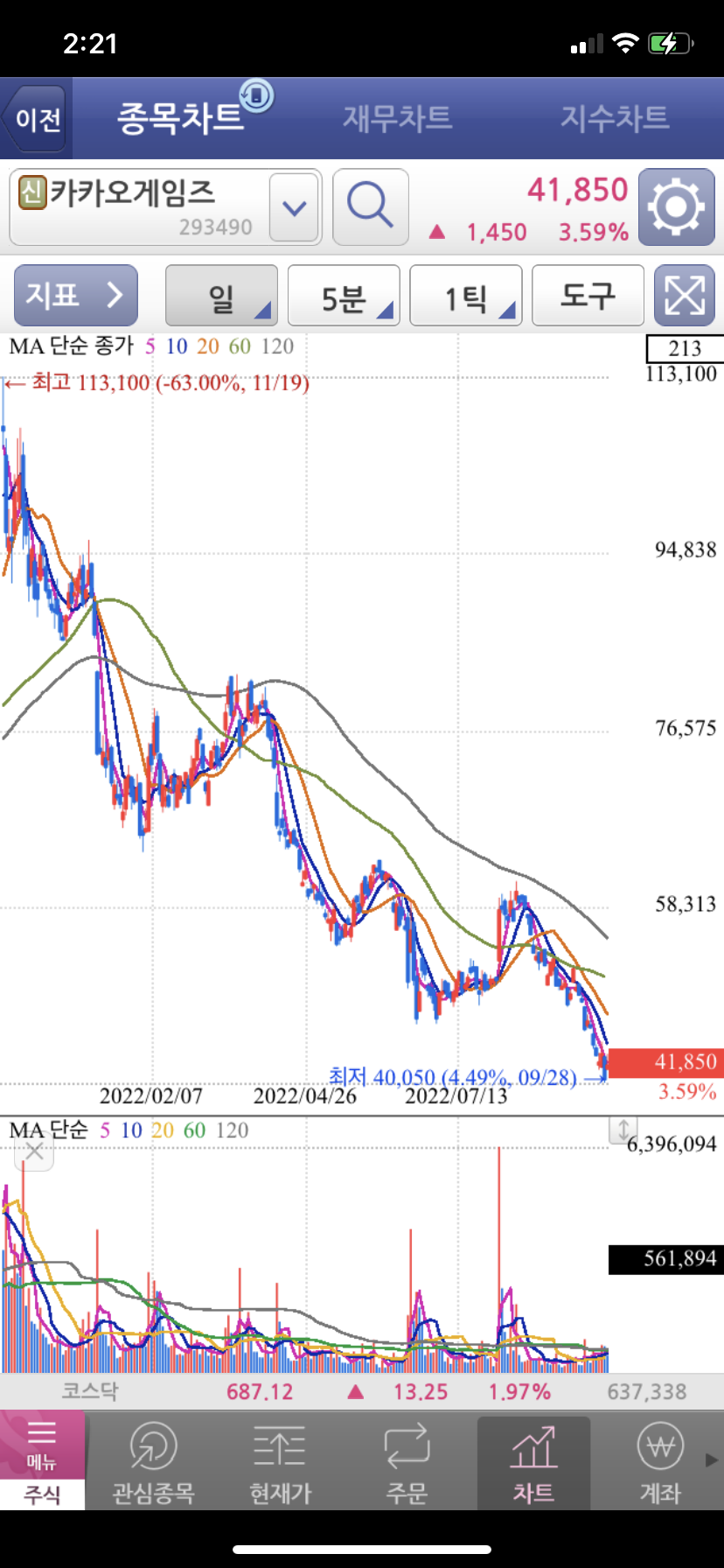 오늘은 카카오게임즈를 눈여겨 보고 있다가 조금 매매를 했습니다