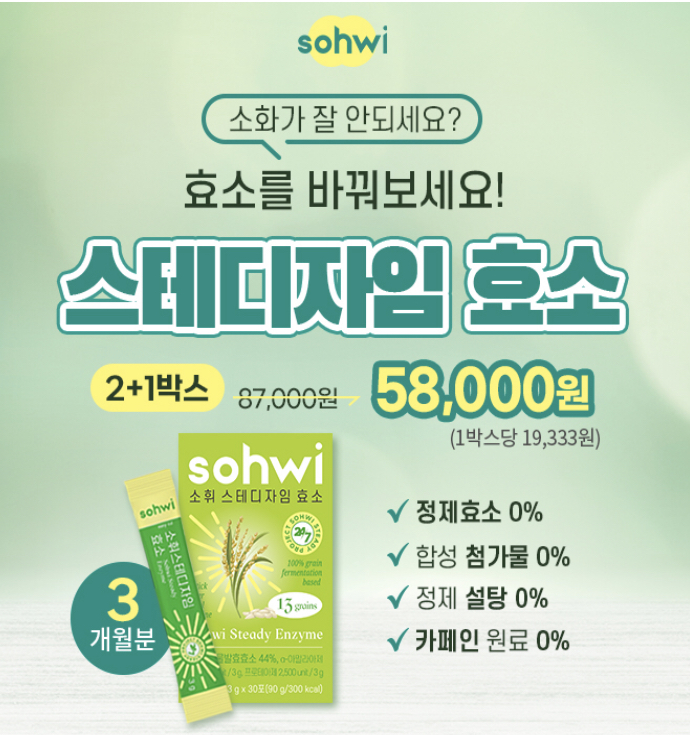 소휘 스테디자임 효소에는 정제효소, 합성첨가물, 정제된 OO, 그리고 카페인 원료가 없습니다. 여기서 OO은? (힌트 : ㅅㅌ)