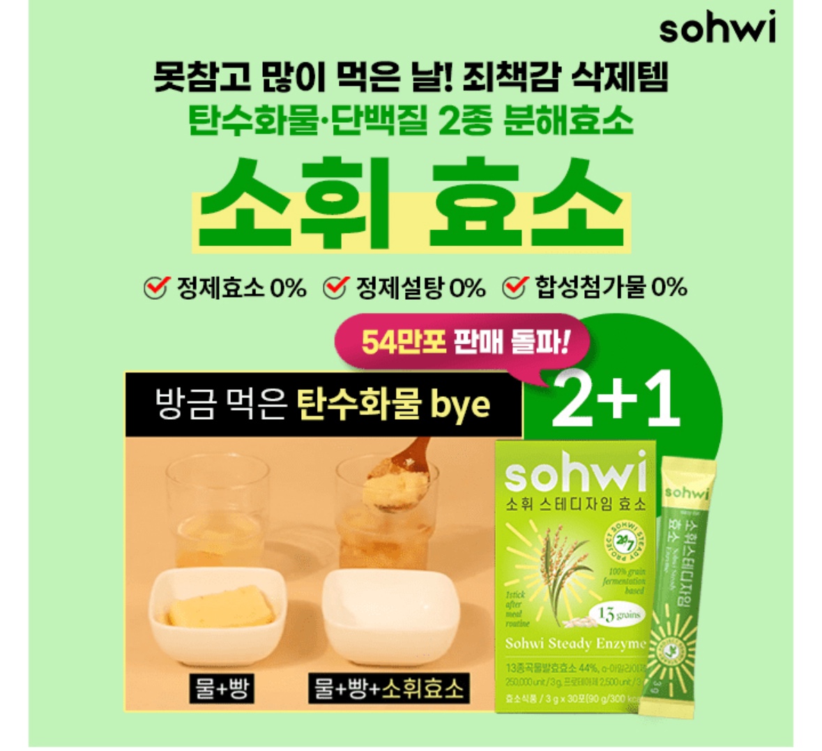 탄수화물, 단백질 2종 분해! 소휘 효소는 OOO의 식습관에 맞추어 탄수화물 분해효소의 활성도에 집중하고, 단백질의 분해 효소의 균형을 맞추었습니다. 식후 1포 습관으로 속편한 하루 되세요! 여기서 OOO은?