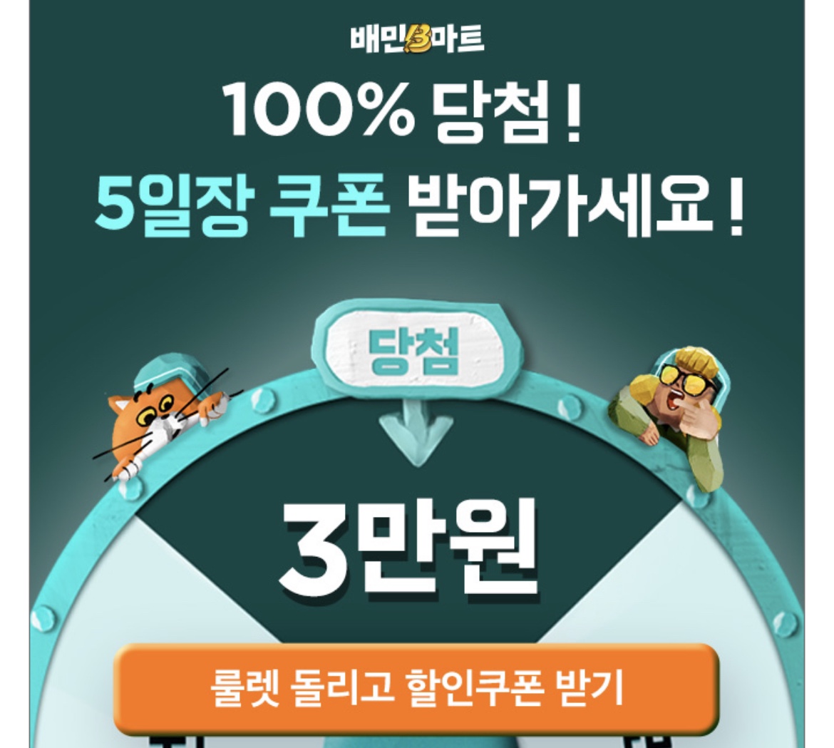 100% 당첨, 최대 3만원의 랜덤 쿠폰! 룰렛을 돌리고 쿠폰을 확인하세요.