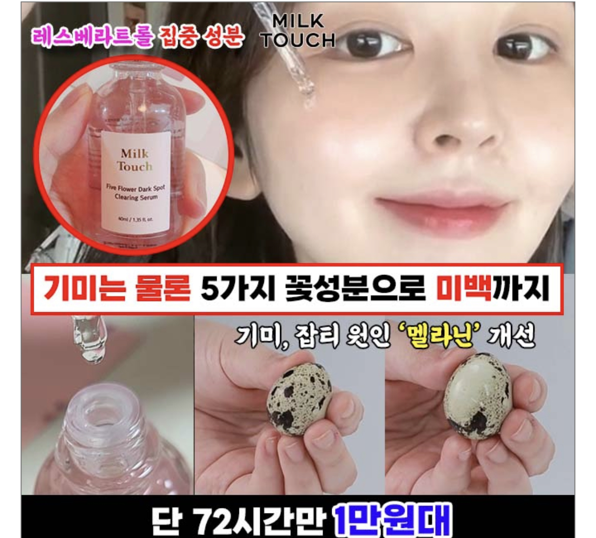 밀크터치 기미토닝세럼은 잡티, 기미 뿌리부터 뽑는 4-STEP 케어로 이루어지는데요. STEP 1으로, 가장 먼저 피부 ㅇ ㅇㅇ면적 개선해 줍니다.