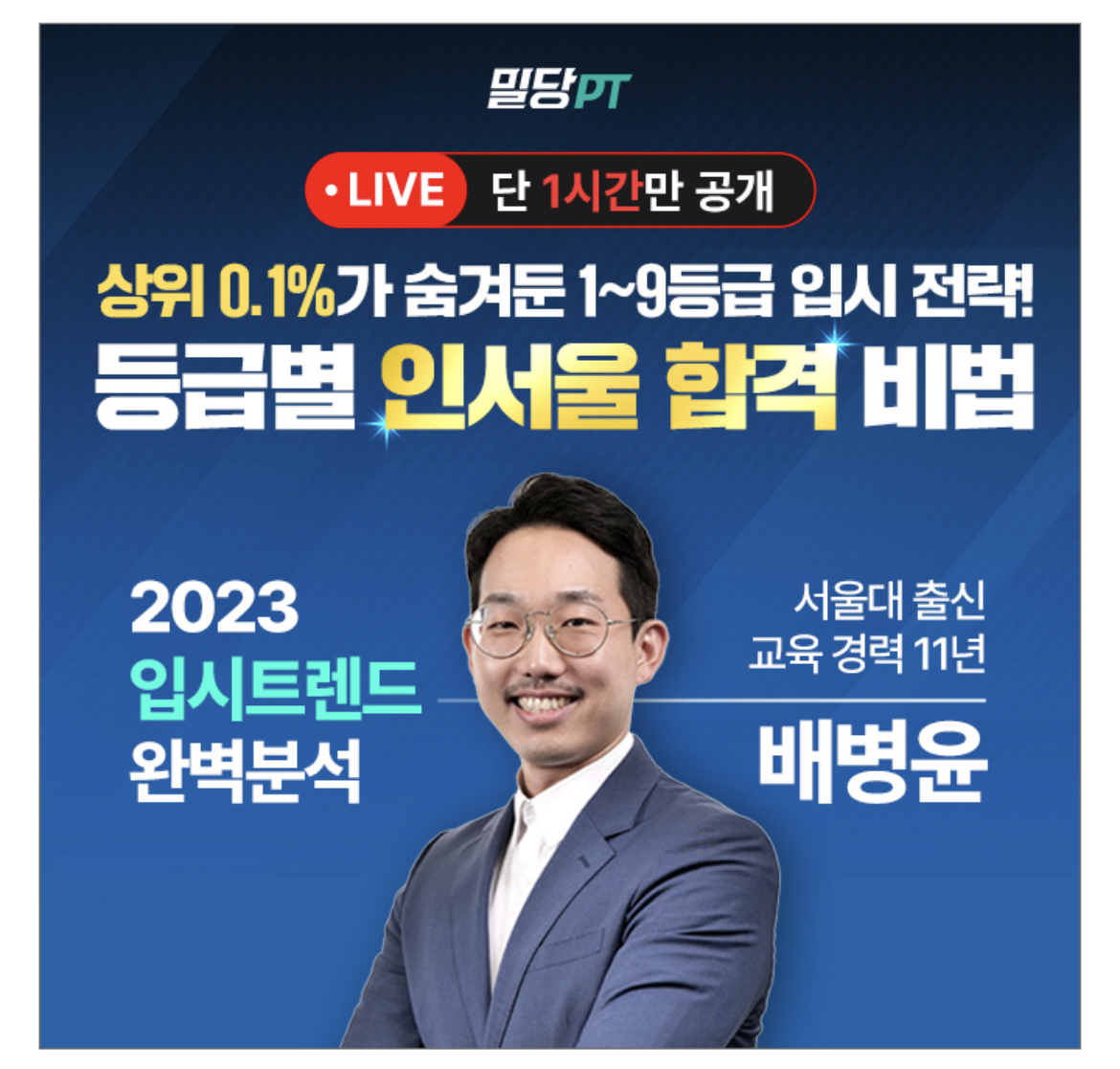 초중고 학부모분들을 위한 시크릿 라이브에는 서울대 출신 11년차 배병윤 선생님이 직접 공개하는 등급 별 성적 올리는 방법과 함께 선착순 OO만원 혜택도 준비되어 있으니 지금 바로 확인해 보세요!