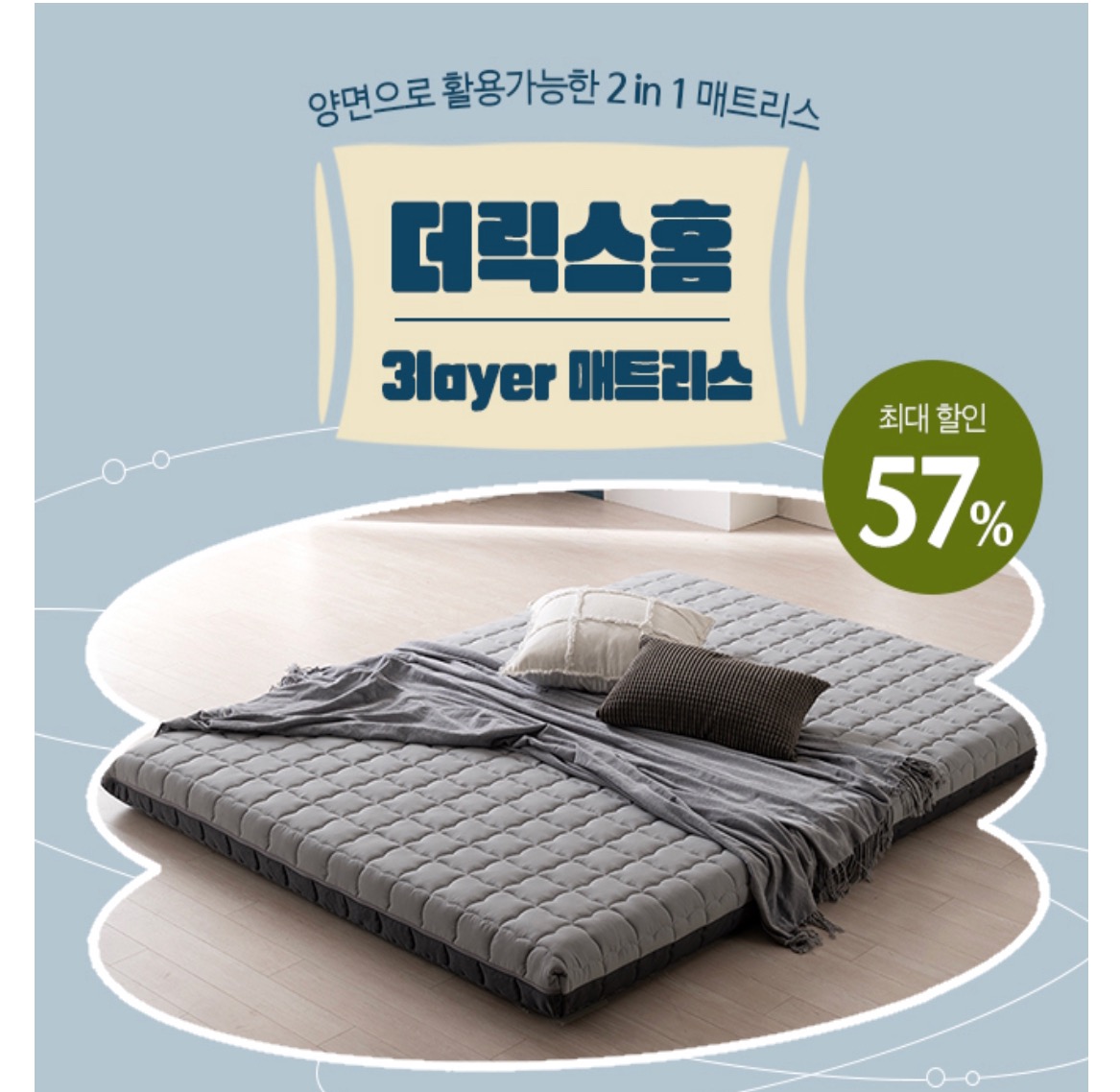 압도적인 OOO 3레이어 양면 매트리스! 3레이어로 더욱 탄탄하고, 편안한 착와감을 느끼실 수 있는 제품입니다. 게다가 자신의 컨디션에 양면으로 활용 가능한 2 IN 1 매트리스! 다수의 판매량과 리뷰, 매트리스 인기 브랜드 더릭스홈이니까 믿고 구매해 보세요! 지금 더릭스홈 LIVE에선 최대 57% 가격 할인 혜택부터 증정품까지! 이 기회 놓치지 마세요