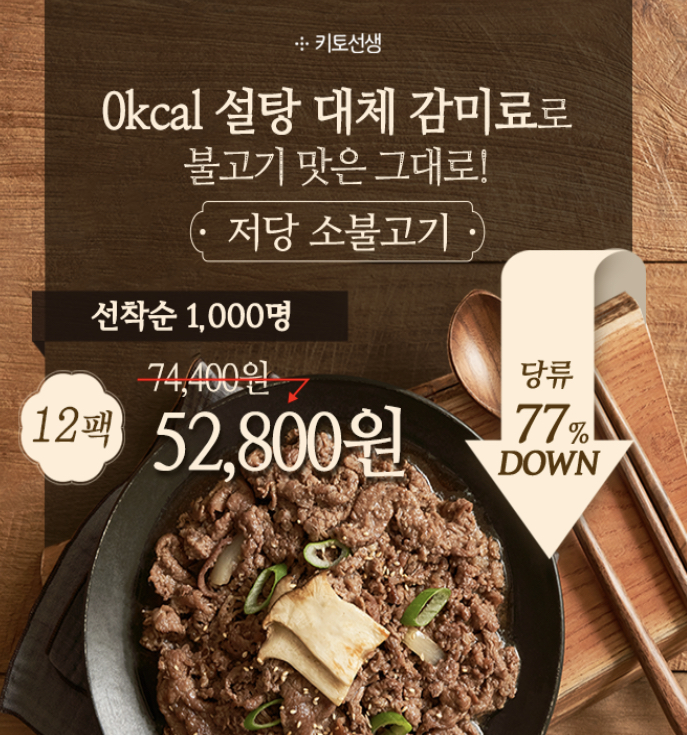 키토선생 저당소불고기는 100% OO OOO 소고기의 살코기가 풍부한 목심을 사용하여 부드럽고 고급스러운 맛을 느낄 수 있습니다.