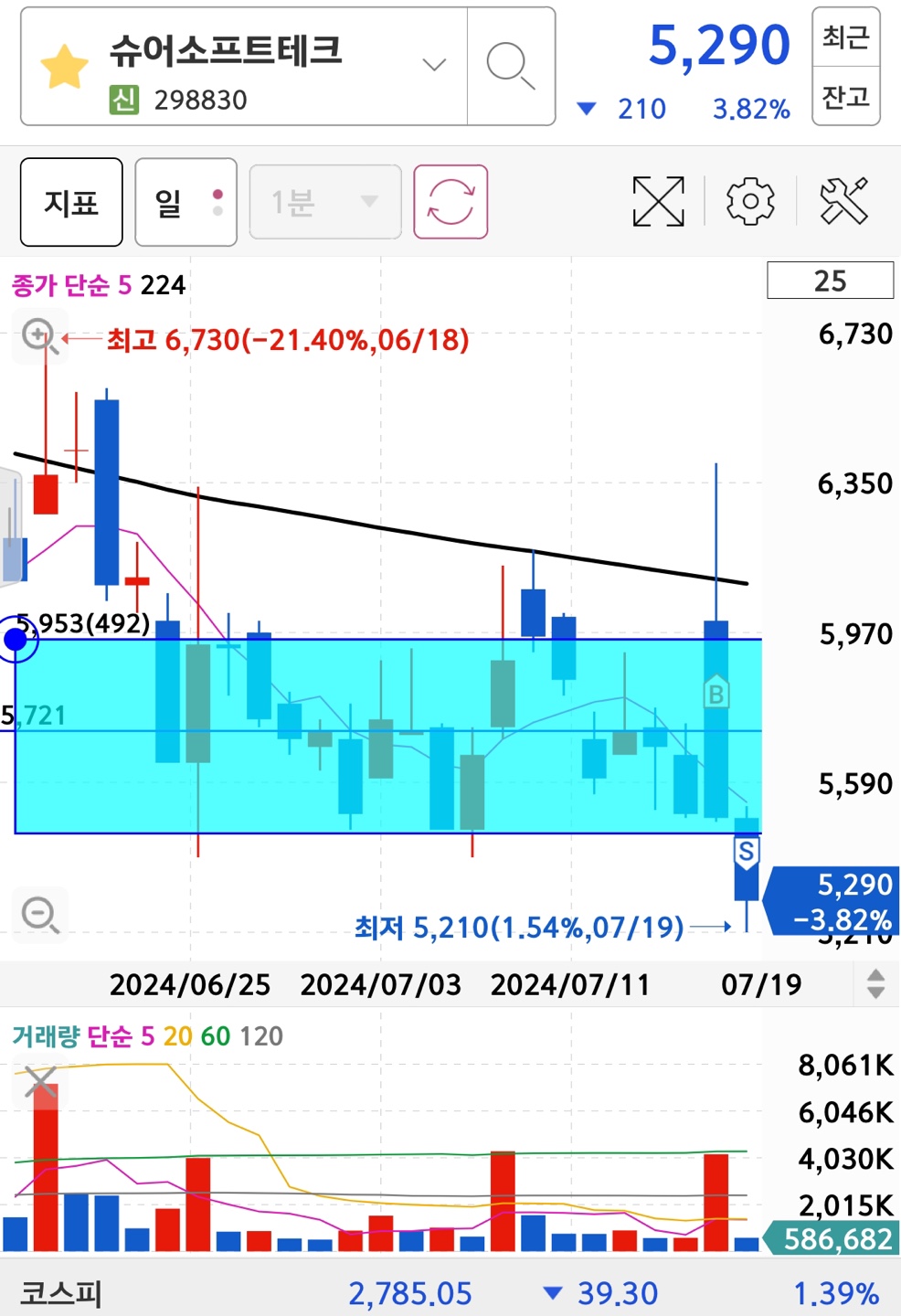 5일선을 두고 손절했으면 좋았을 것을 -9% 아우~ 이게 뭐야 ㅋ