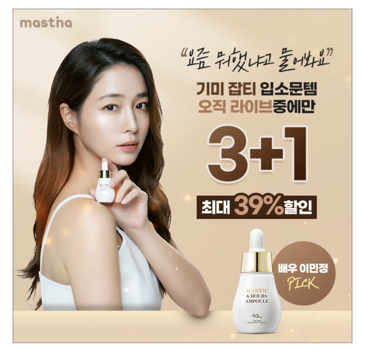 따스한 봄 햇살에 기미가 걱정된다면? 임상결과, 1회 사용 6시간 수면 후 기미, 잡티, 주근깨 완화부터 피부톤까지 UP! OOOO 매스틱 6아워스 앰플로 걱정 끝내세요! OOOO에 들어갈 이름은 무엇일까요? 지금 LIVE에서 만날 수 있습니다! (초성힌트 : ㅁㅅㅌㄴ)