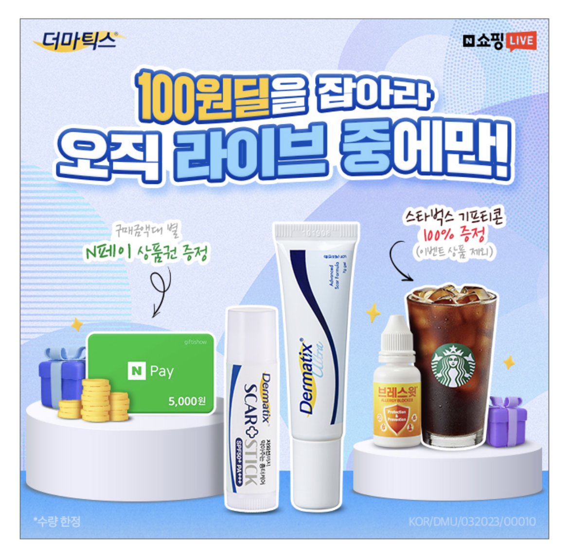 오직 OOOO 쇼핑 라이브에서만 만날 수 있는 혜택 총집합! OOOO 구매 시 최대 20% 즉시 할인, 스타벅스 기프티콘, 네이버 페이 상품권에 100원딜까지 노릴 수 있는 이 브랜드는 무엇일까요?