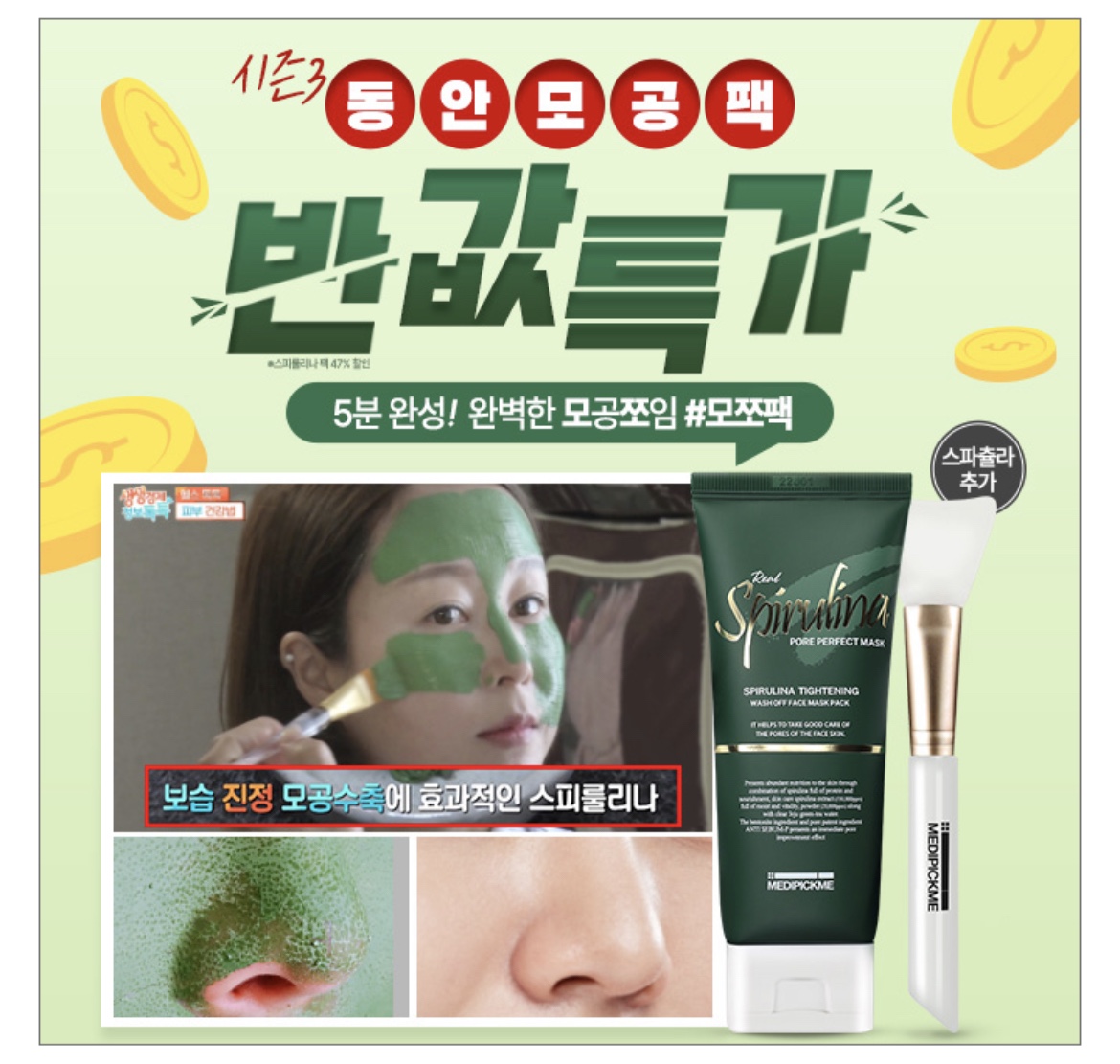 '메디픽미 스피룰리나 마스크팩'은 시즌3로 출시하며 동안푸드라 불리는 스피룰리나의 함량이 57% 높아졌는데요! 또한 단 1회 사용만으로 즉각적인 4중 모공 개선 인체적용 시험을 완료하였습니다. 일명 'OOO'이라고도 불린다고 합니다. 스피룰리나 마스크팩의 애칭은 무엇일까요? (힌트 : ㅁㅉㅍ)