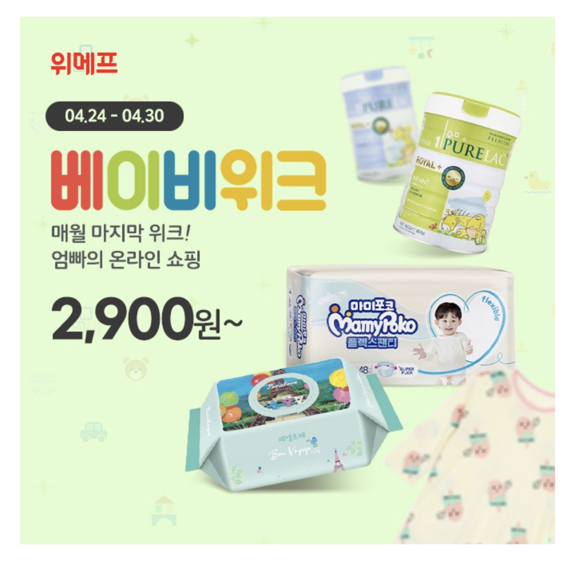 4월23일~4월30일 위메프에서는 베이비위크가 집행됩니다! 다양한 혜택가로 누리는 엄빠의 온라인 쇼핑! 육아OO핫딜코너에서는 육아 필수템 할인템 모두 모아두었으니 지금 확인해보세요~! 과연 OO에 들어갈 말은 무엇일까요?