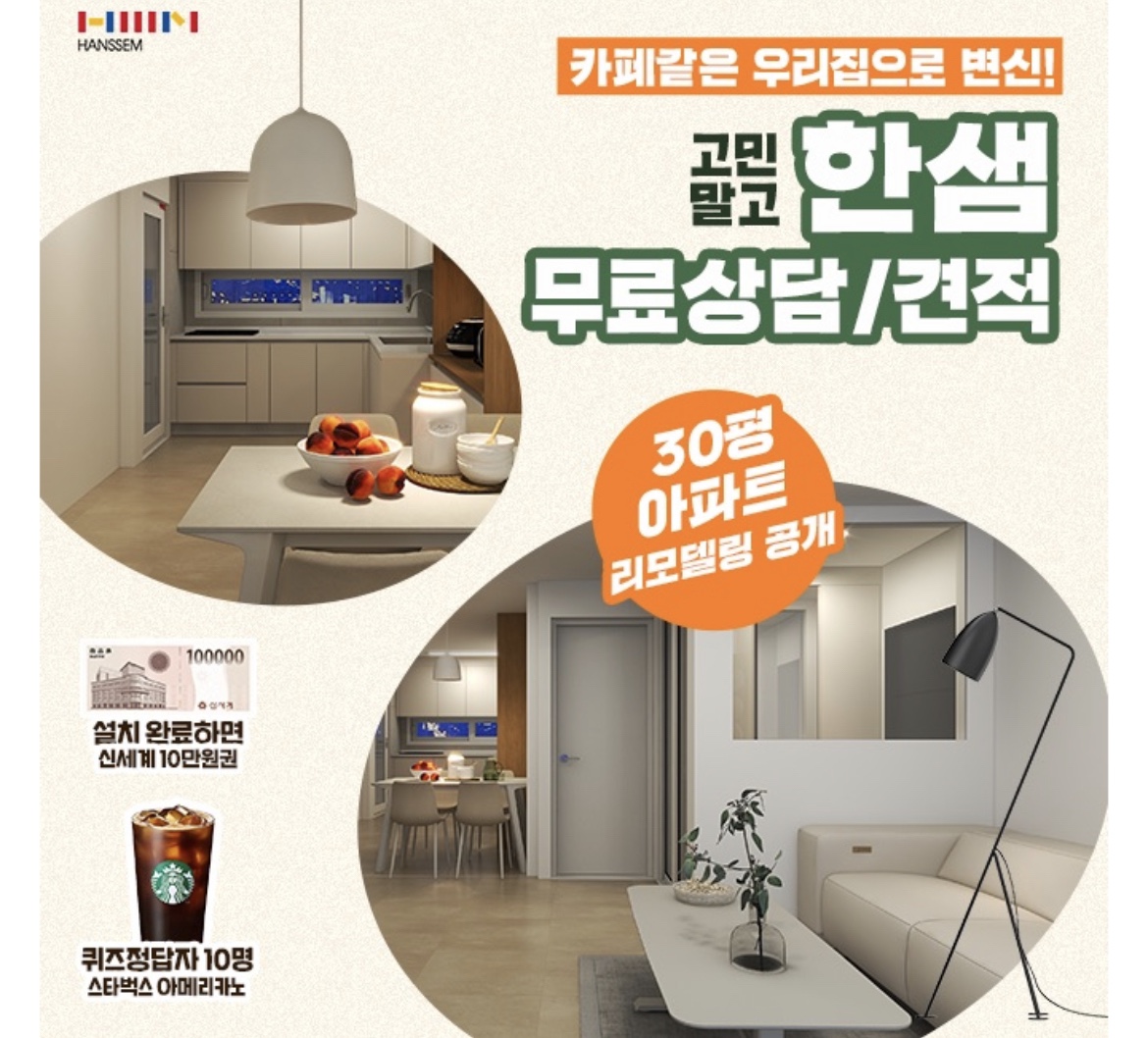 [오픈하우스] OOOO5차 30평 리모델링 전격 공개! 카페같은 우리집은 한샘 무료 상담+실측+견적 부터! 방송 중 퀴즈 참여자 스타벅스 쿠폰 사은품까지 놓치지 마세요! 빈칸에 들어갈 단어는 무엇일까요?