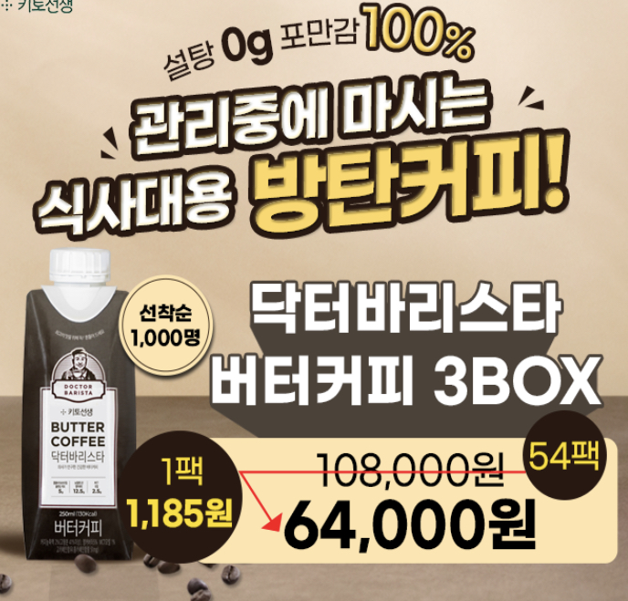닥터바리스타 방탄커피는 원두의 풍미가 담기고 한국 사람들의 입맛에 맞추면서도 좋은 영양과 방탄커피의 효과는 그대로 담았는데요. 이제 닥터바리스타로 건강한 OOO 잡아보세요. OOO은 무엇일까요?